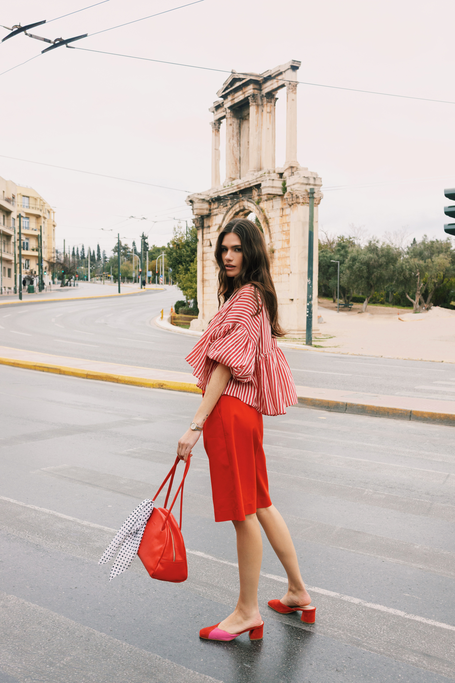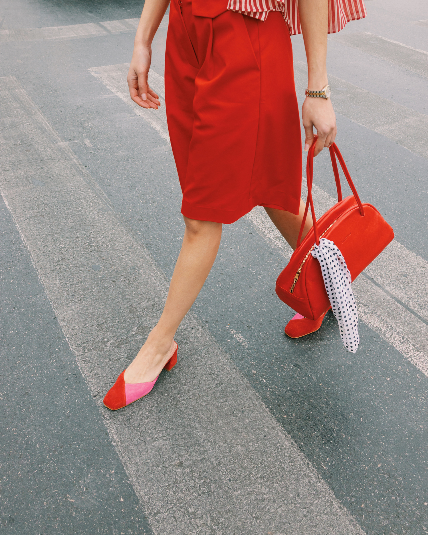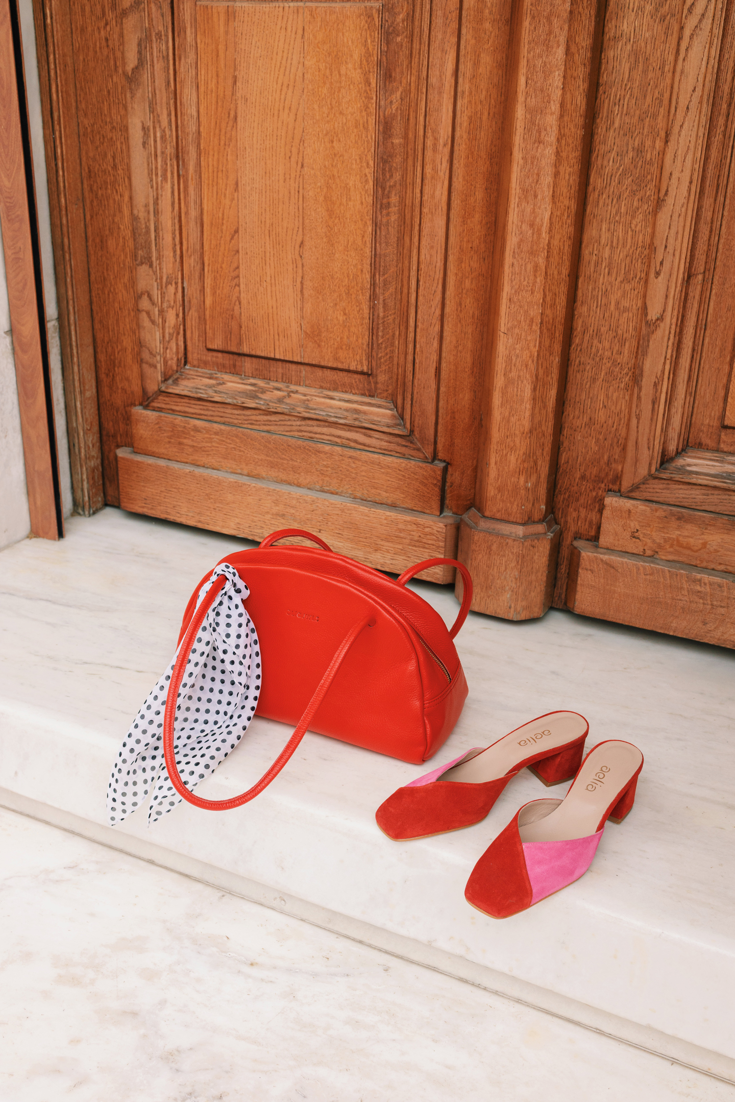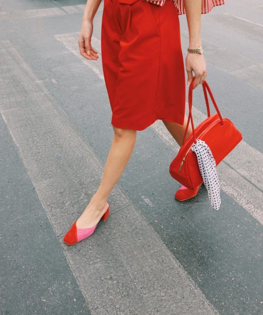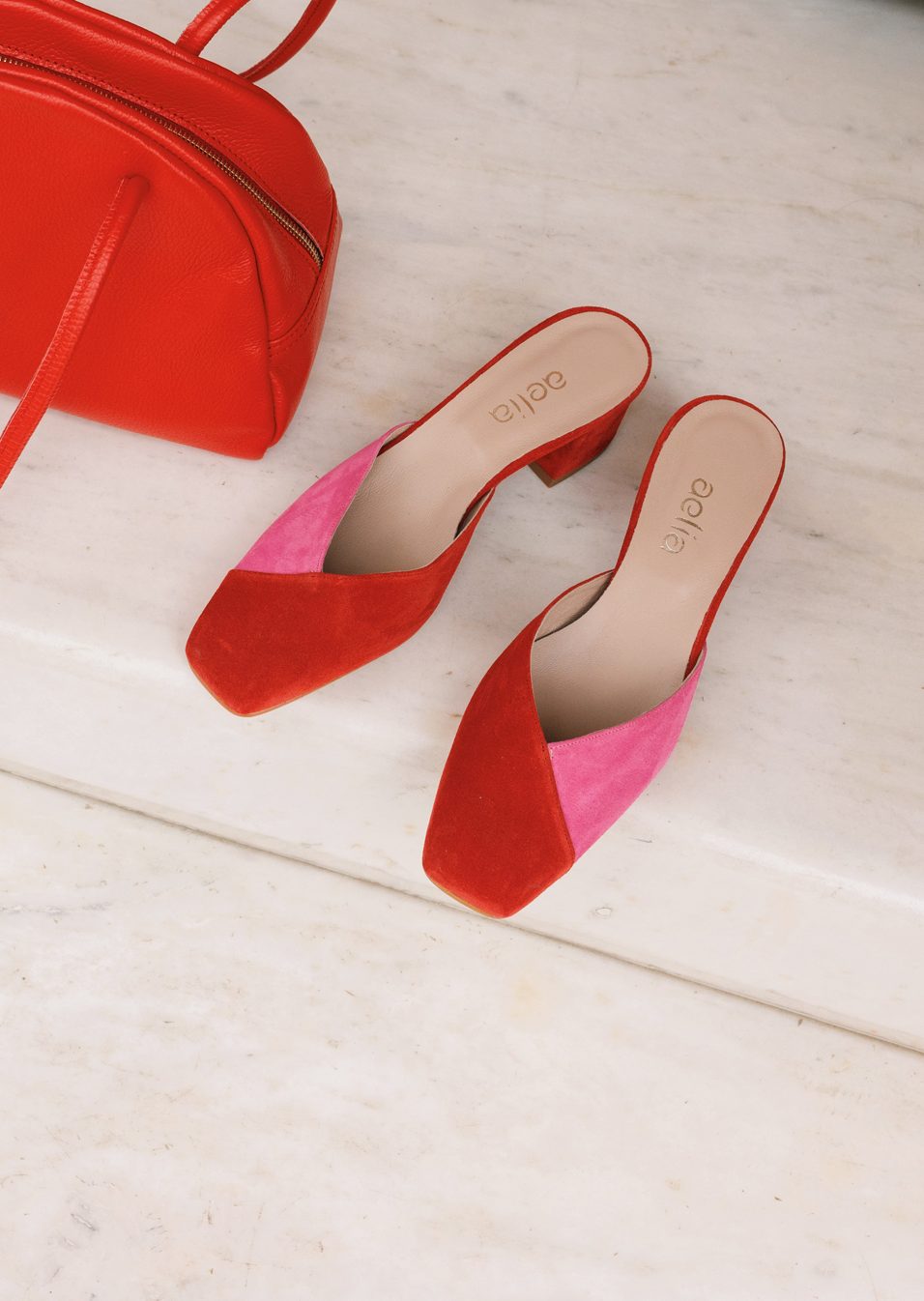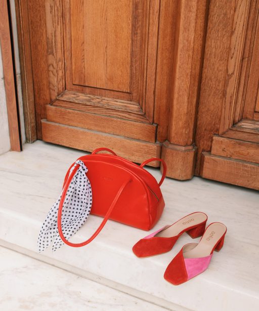 Δερμάτινα mules σε συνδυασμό κόκκινου και ροζ με καθαρές γραμμές και κομψή σιλουέτα. Ένα θηλυκό σχέδιο που φοριέται από το πρωί έως το βράδυ.